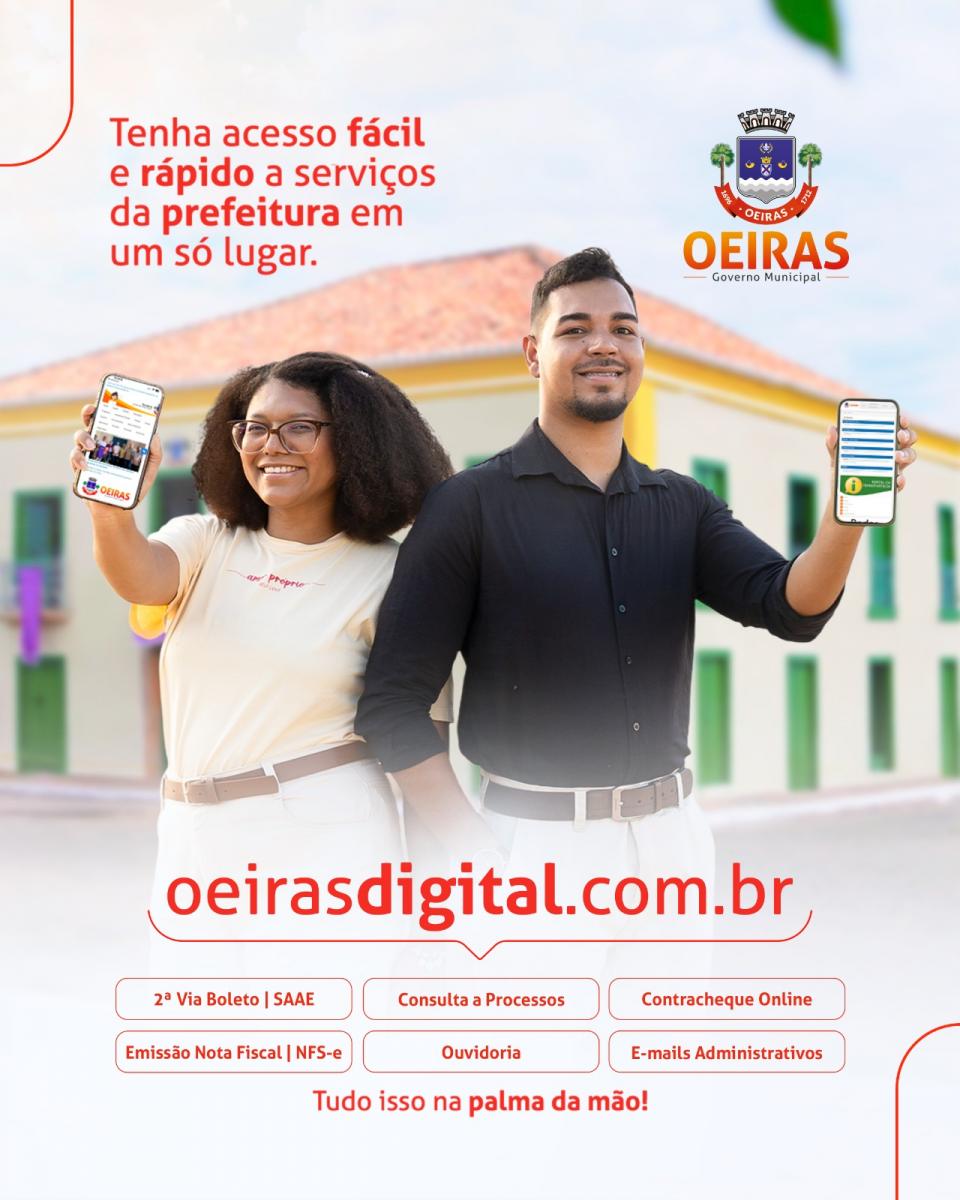 A Prefeitura de Oeiras lança o Oeiras Digital www.oeirasdigital.com.br , uma nova plataforma online que visa simplificar e agilizar o acesso dos cidadãos a diversos serviços essenciais. Agora, os moradores podem realizar consultas e solicitar documentos de forma remota, eliminando a necessidade de deslocamentos e filas.