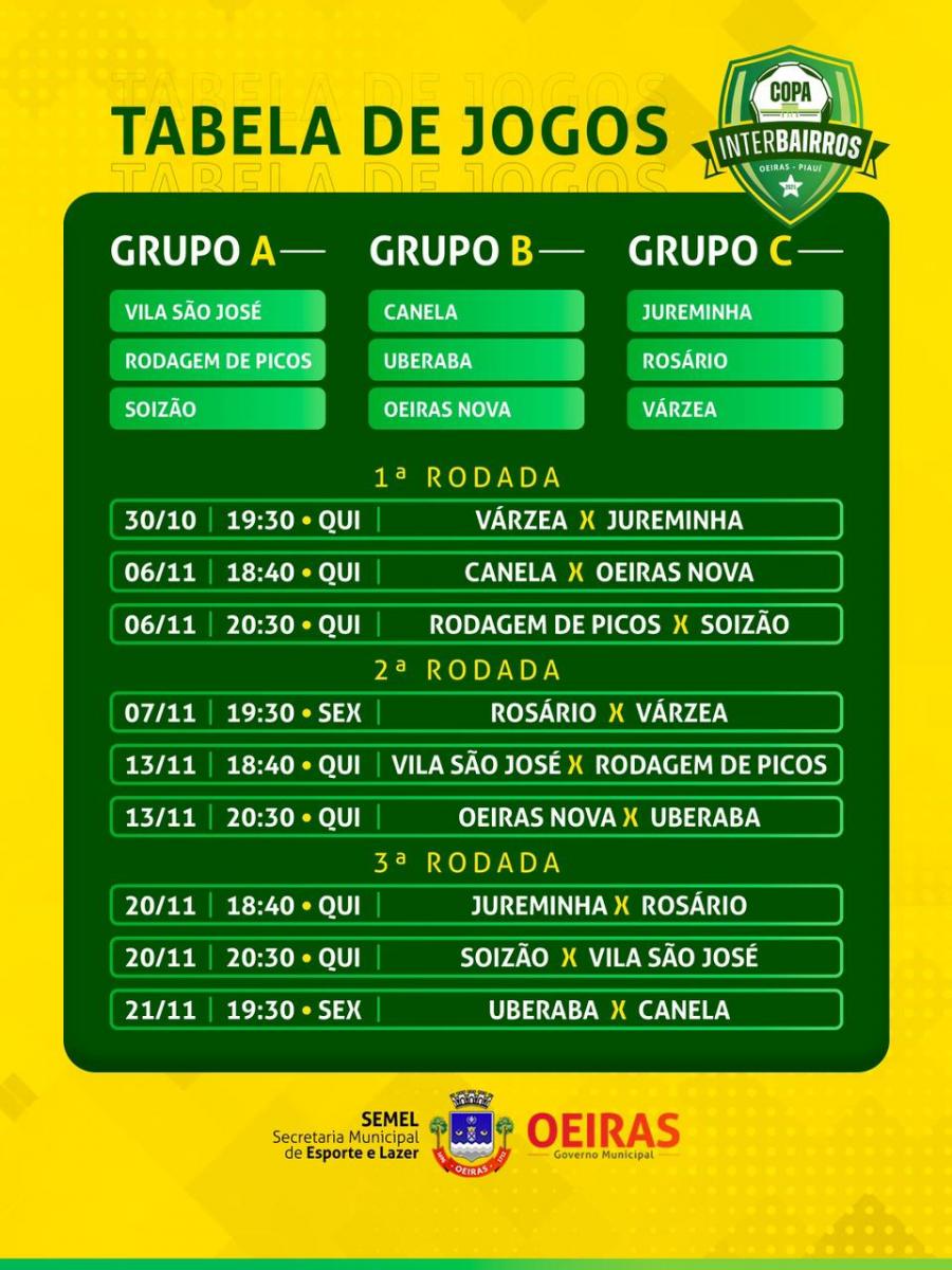 A Prefeitura de Oeiras, por meio da Secretaria Municipal de Esporte e Lazer (SEMEL), anunciou o calendário oficial da Copa Interbairros 2025. O torneio de futebol amador ocorrerá entre 30 de outubro e 12 de dezembro. A premiação total para os times vencedores está definida em R$ 25 mil.