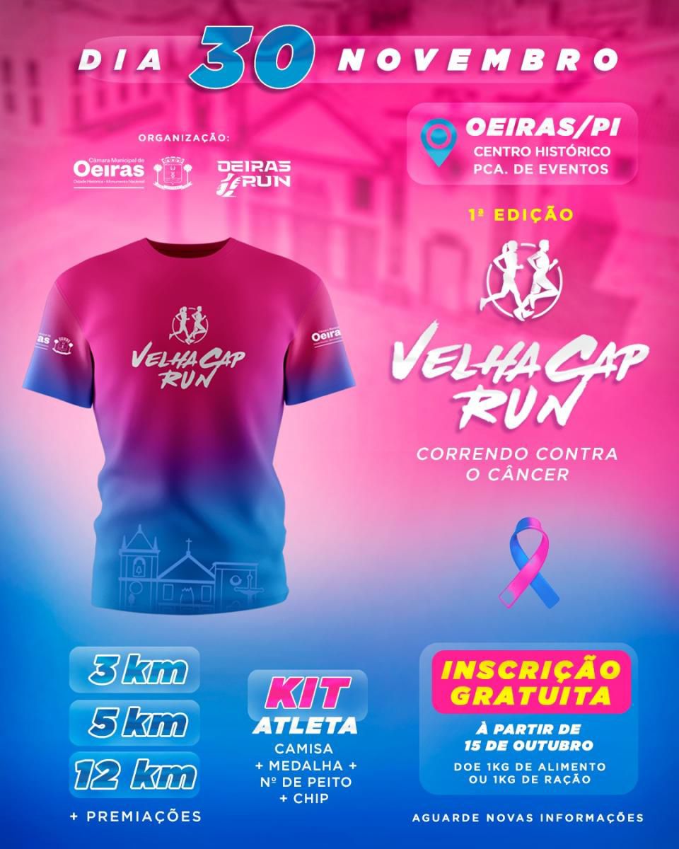 O circuito de corrida "Velha Cap Run" está chegando e acontecerá neste próximo dia 30 de novembro. Este evento inédito é uma realização da Câmara Municipal de Oeiras e do grupo Oeiras Run, contando com a importante colaboração da Prefeitura Municipal de Oeiras, por meio da Secretaria de Juventude e Esportes.